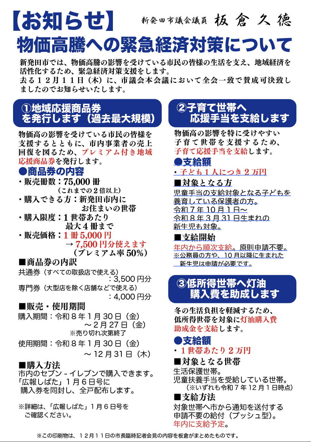 ・国の「強い経済を実現する総合経済対策」(2025年11月28日閣議決定)を受け、 低所得世帯支援 および 物価高騰対策 を早急に実施する必要があるため。